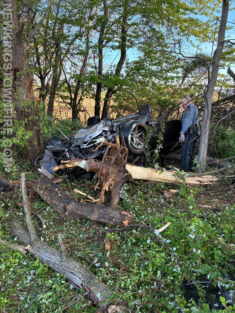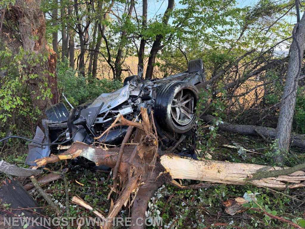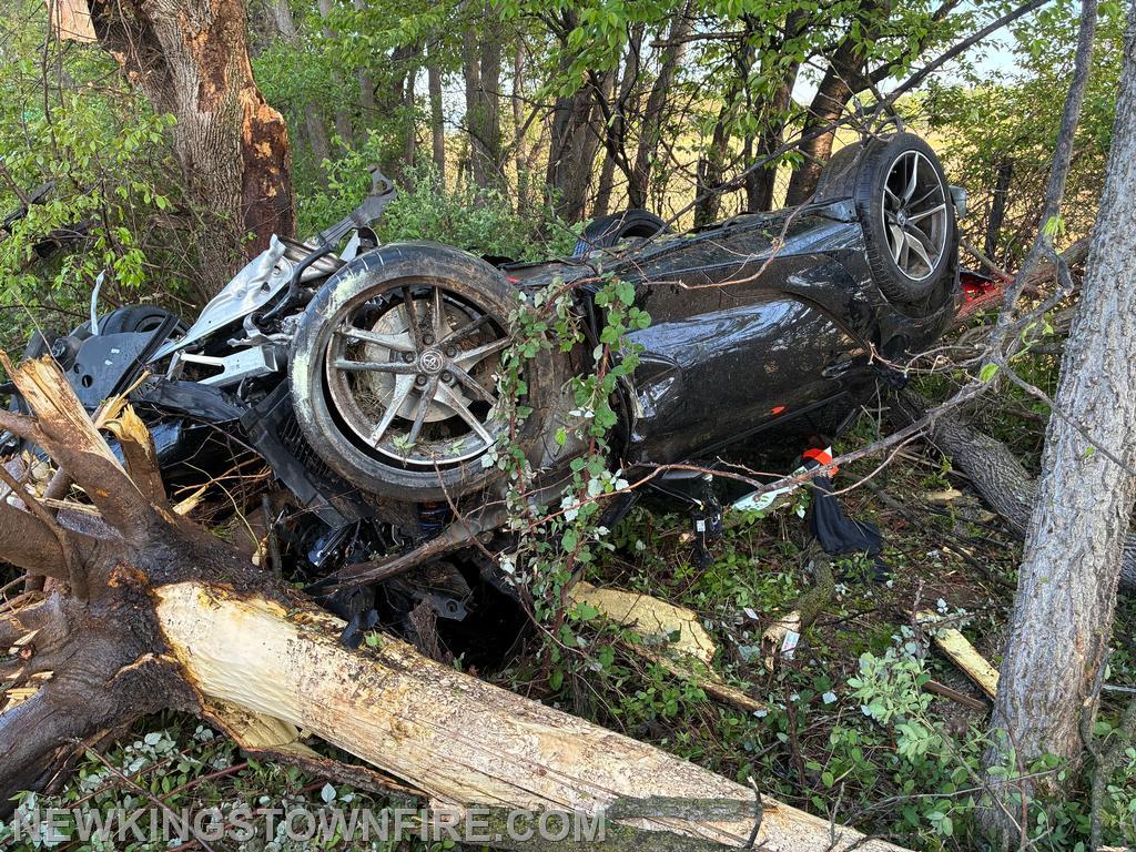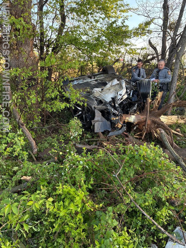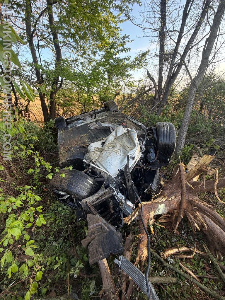 Shortly after 07:00 Saturday morning, Companies 33 and 31 were sent to the area of MM53.2 SB for an accident involving an overturned vehicle, reported to be on fire. Squad 33 (6), Traffic, and Chief 33 responded. Chief 33 was advised of occupants out of the vehicle and the vehicle rolled into the woods on fire. While passing the incident in the NB lane, smoke was visible. Company 33 used the crossover at MM54 to come back south. Both Squad 31 and Squad 33 arrived together, with Squad 31 placing one handline into service and Squad 33 taking patient care. The fire was quickly contained. Once EMS arrived, care was transferred and crews assisted with preparing the patient for transport. All units cleared the scene at 07:42 with PSP remaining on scene.
